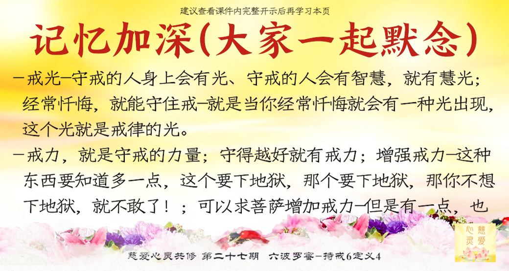 你守戒守得越好,你的身体就会产生一种力量叫戒力。戒力,就是守戒的力量。也就是说,一个人整天地忏悔、守戒,常说我这个地方做错了,我那个地方做错了,你下次就不会做错了,这个戒力就会越来越强了,就会产生一种光,这种光会去除你见愧的光,就是说去除你不认为自己很惭愧。否则让你慢慢觉得很惭愧的这种光照着你,你会觉得很丢脸,自己会觉得我做错多少事情。。。因为他守戒了,因为他忏悔了,因为他知道他做错了,他下一次才不会去做。这就是一种忏悔力,就是渐渐感到自己羞愧的力量,是一种自我加持的光。实际上这是什么?因为我戒了,我忏悔了,你就会加持自己了,而且你就会得到菩萨的加持。。。一定要守戒,懂忏悔。