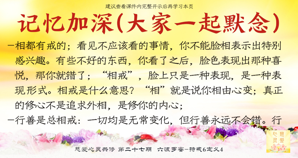 依戒律而行,要融入生活中,化作一种自然的习惯。比方说,你们从现在开始让自己养成习惯:不管谁帮你做点事情,“谢谢啊!感恩啊!”老公帮你做事情,“谢谢啊”。过去中国文化上讲“礼多人不怪”,你很客气,人家不会怪你“你怎么这么礼貌啊?你很有毛病啊!”你越跟他说“谢谢啊!感恩哦!”他越觉得自己惭愧。所以一定要礼多,一定要把它养成一个习惯。就像很多人刷牙天天要刷,脸天天要洗,你把反省自己身上的毛病看成天天要做的事情。今天一起来,“我骂人了吗?”“没骂。”很开心。“我今天讽刺别人了吗?”“没有。”很开心。“我今天嫉妒别人了吗?”“没有。”像菩萨了。就是这样养成习惯。一想要嫉妒别人了,“哎哟,不能”,从来不嫉妒别人,成功了,把它养成为一个好习惯。菩萨都有好习惯的。菩萨的好习惯是什么?碰到事情就慈悲,碰到事情就想帮助别人,这就是菩萨。你们要把这些好习惯全部放在心中,那么你们才能到天上跟菩萨在一起。否则,菩萨一碰到你们就想慈悲施舍给你们,你们一看见菩萨就想问菩萨拿东西,“菩萨给我加持吧”,等到哪一天跑到西方极乐世界,“阿弥陀佛,我终于来了,看到您了,您赶快给我加持吧。”境界不一样啊!所以,好的自然习惯就一直好下去,不好的自然习惯……有些人有一个不好的习惯:喜欢拿东西、偷人家的东西,喜欢看见没人动的、没有人用的东西,他就拿走了藏在口袋里,而且拿过还忘记,最后人家说:“我东西到哪里去了?”“没有啊。”他真的不知道。“你摸摸口袋。”“你看看我有吗?哎哟,真的在这里。”