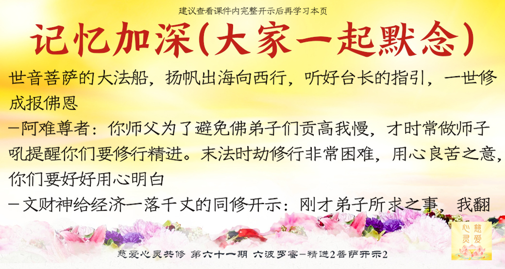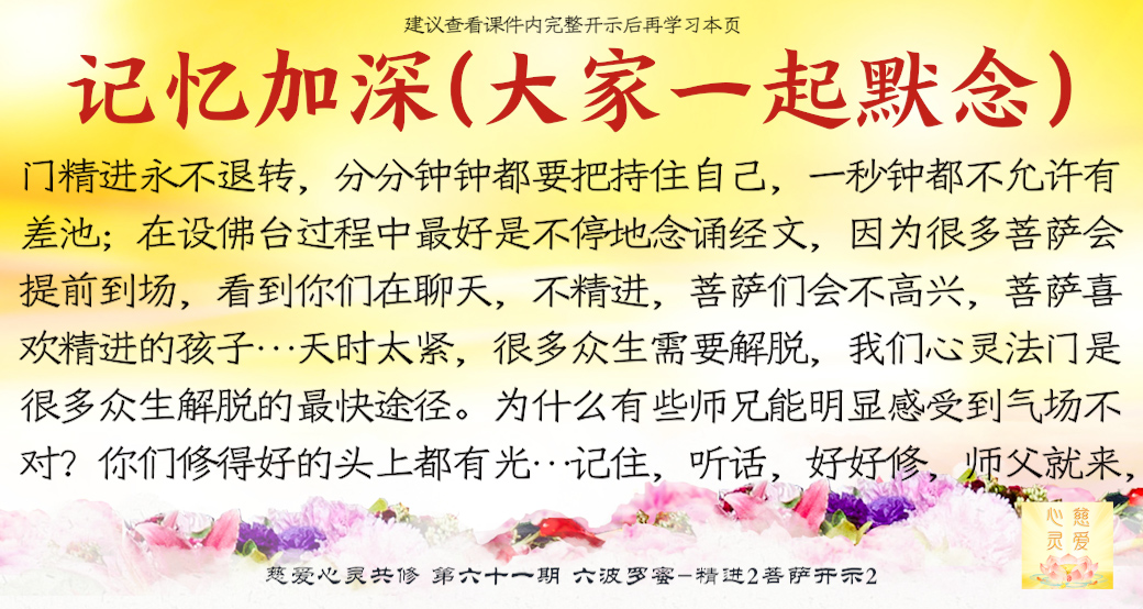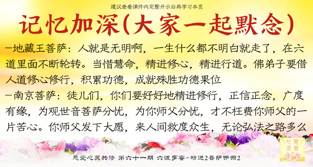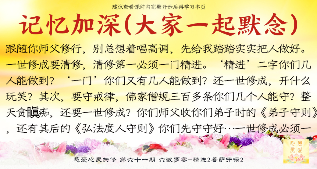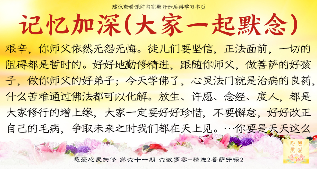 师父看到你们的成长——但是不要只是暂时的,永远保持这种精进的心,师父最开心了。很多弟子很诚心啊,真的感动天地啊。你们当中有很多都是有来历的,不要忘记自己最终的归属是在佛国净土、西方极乐世界的莲花池里,不是人间啊。感恩阿弥陀佛、观世音菩萨、大势至菩萨,感恩十方一切诸佛菩萨保佑。