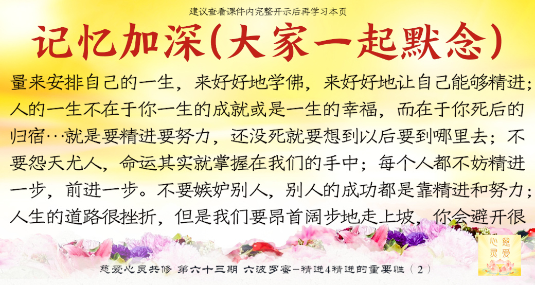 行善要及时,功德要持续,一个人几十年的生命,真正做人做事的时间很少很少,再勤劳的人也就做了自己一生的1/3呀!当你懂得人生真谛的时候,你会用你的智慧和毅力安排你的人生。这就是我们现在学佛人的人生,我们没有浪费,我们很开心。很多人不知道,一旦查出癌症了,医生告诉他只有三个月、六个月的时候,你知道他等于判死刑了,他才知道生命原来这么短给他。所以我们学佛人不可拖泥带水,前脚落地,后脚还不肯挪开呀。记住了,前脚落地,你后面那个脚就要忘掉它,赶紧往前走了。你的前脚就是你的今天,加紧脚步啊。你的昨天就是你的后脚,我们要把心专注在今天,而不能专注在昨天,否则你永远走不出来你的人生的坑坑洼洼的泥泞小道。所以要学会往前,精进努力学习,把自己的慈悲心修出来,把自己以快乐、慈悲、同情心、谅解心、容忍心、宽心、爱心、悲心全部修出来,把这些善良的像一朵一朵的莲花一样全部贡献给世人。让别人快乐的人你一定快乐,让别人难过的人你一定会伤心,你让别人瞋恨你一定会受苦。所以我们要学,我们真的要学,我们要制止自己心中的罪恶,我们要跟自己心中的恶念作斗争,积极地用善良的心念去改变自己。所以希望大家好好学佛,好好修心,希望大家能够在学佛当中认清人生的真谛,改变自己,让自己回到一个真我,学会真正地理解这个世界的真谛——那就是无常。
