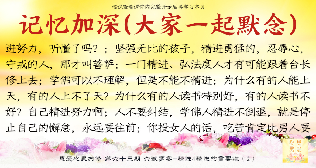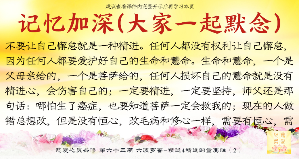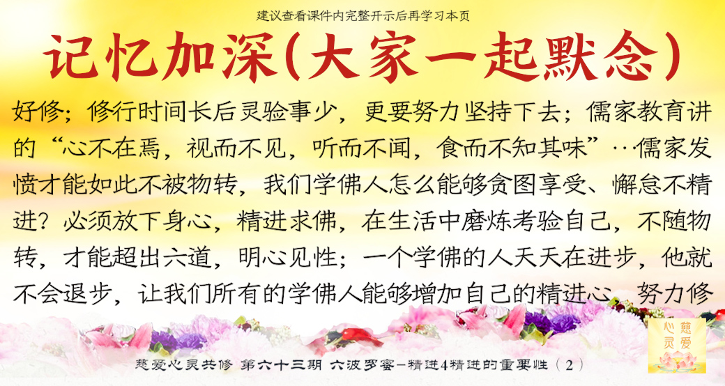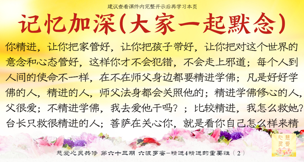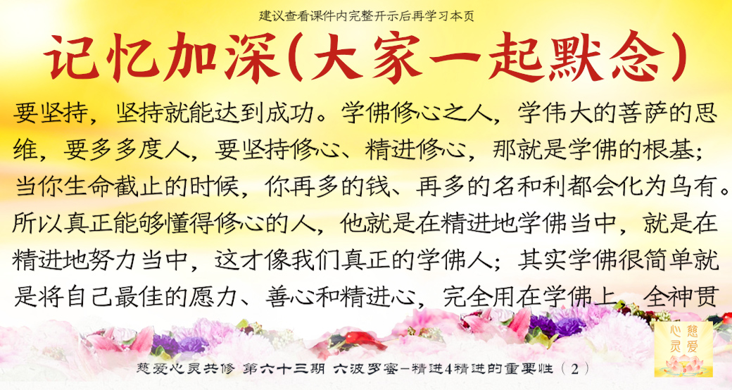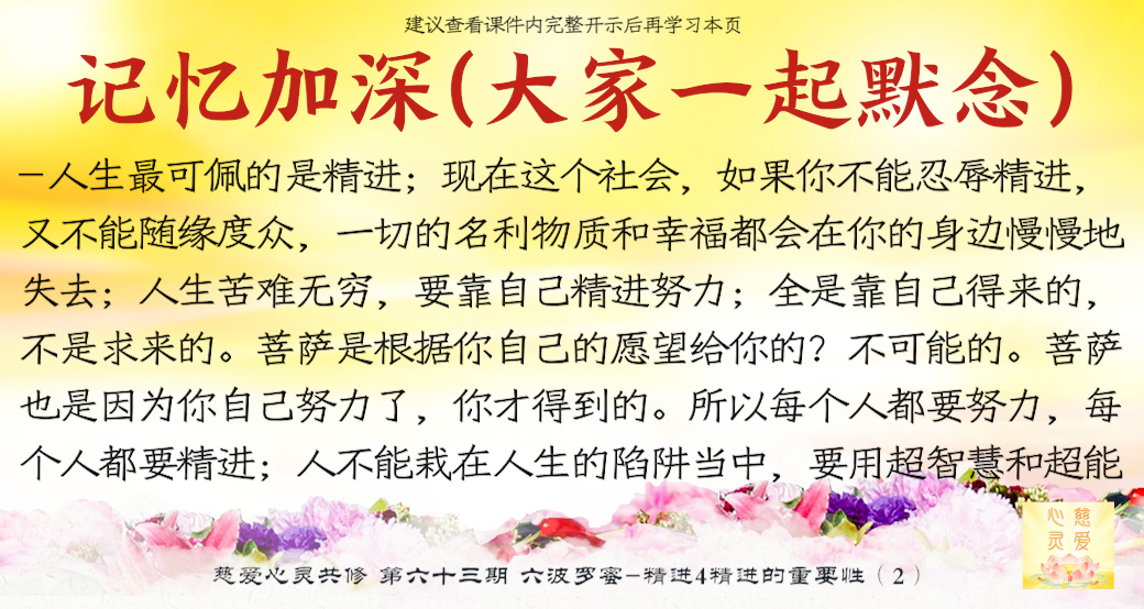 一个学佛的人天天在进步,他就不会退步,让我们所有的学佛人能够增加自己的精进心,努力修行,我们拜着观世音菩萨,我们头上顶着我们的佛陀,我们心中拥有着更多的菩萨,让我们在人间修出一块净土出来,这就是人间净土。