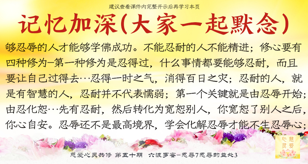 修心当中总会碰到阻碍、烦恼和业障,怎么样来忍耐?人家诽谤你、阻碍你,你不能有怨气,不能发怒,因为不怨、不怒,实际上第一个关键就是由忍辱开始,所以有一句话就是“由忍化恕”,先有忍耐,然后转化为宽恕别人,你宽恕了别人之后,你心自安。忍辱还不是最高境界,学会化解忍辱才能不生忍辱心。很多人非常恨自己的老公,恨自己的老婆,实际上就是你没有宽恕对方,一旦你原谅宽恕了对方,你就会自己感觉到安全了。