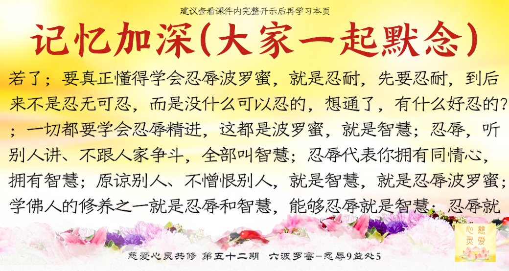 “般若蜜”是什么?就是智慧。就是要把自己忍辱的智慧修出来。我为什么要忍辱?因为我是在消自己的孽障。为什么要忍辱?因为我过去生中欠人家太多。为什么觉得忍辱?我不要忍辱,因为我该还给人家的,我都还给人家了,还人家的时候很难过,贪人家钱的时候很容易,所以还人家债的时候就要学会忍辱,这是因为你在偿还自己过去生中的债务,就像还房子的贷款一样,还钱的时候很难过,不要去想,因为你借钱的时候已经种下了这个因,这就叫忍辱般若蜜。要能够想通这个事情,我忍辱的最关键在什么地方,我把它想明白了,这就叫忍辱般若蜜;想不明白,就是没有智慧。
