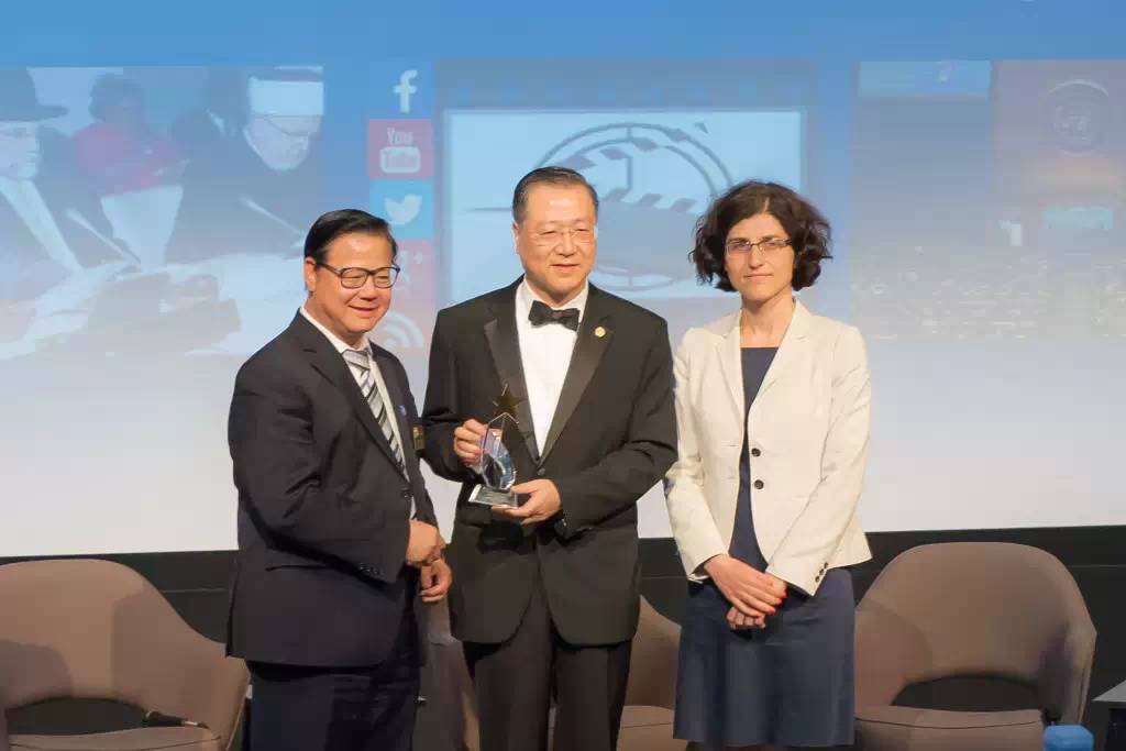 在今天的颁奖仪式上,洛杉矶圣盖博市廖市长受会议主席的委托,在会上热情介绍了卢台长几十年来秉承大乘佛教的慈悲众生、弘法利生的出世精神,爱国爱教,广度有缘的入世情怀,以他菩萨般的善心、善念、善行感化无数人学佛修心。廖市长激动地说,卢台长是华人的骄傲。会上还播放了卢台长在全球弘法的片断,恢宏的场面,真挚的感情,热情的微笑,感动着全场的听众。